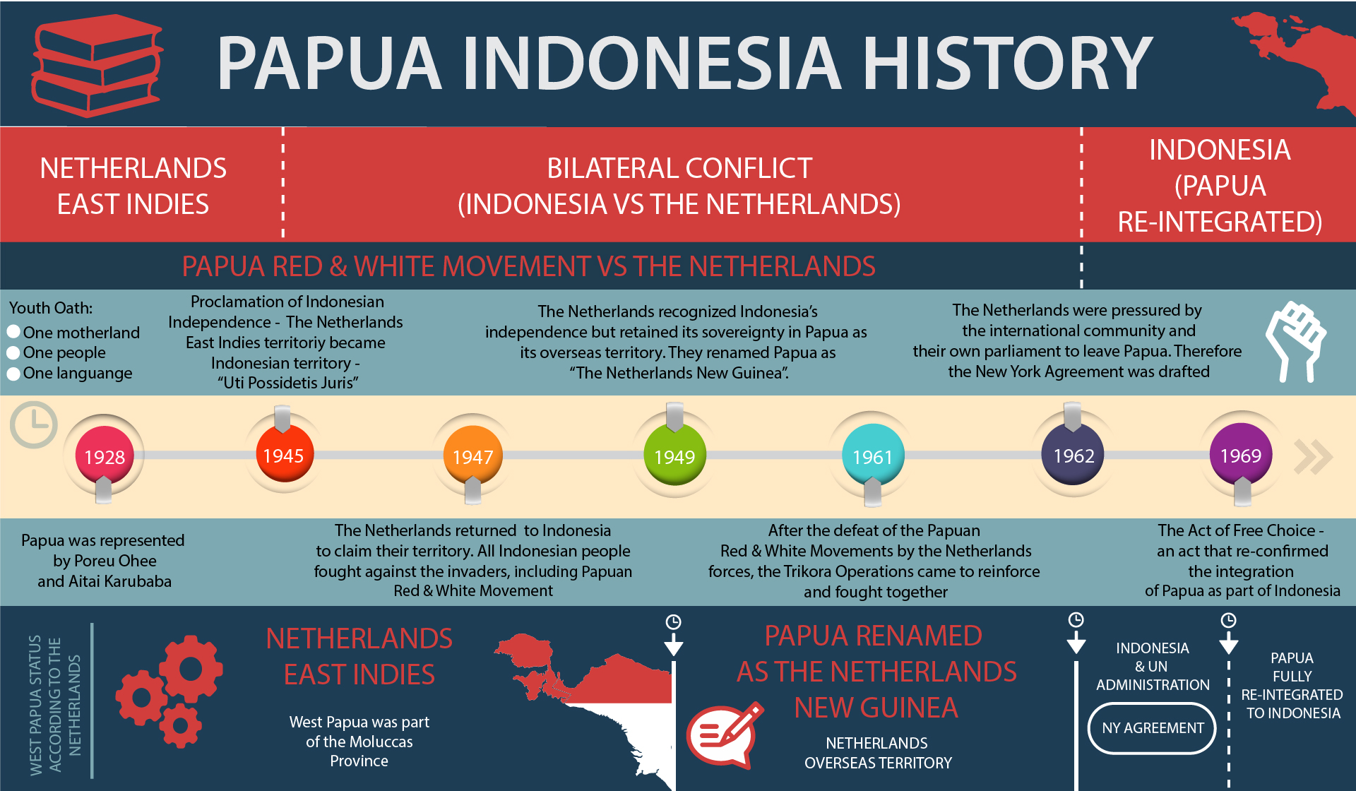 Papua Since 1928 West Papua NowDecember 6, 2018Infographics Post navigation PreviousNext A brief historical timeline of Papua since Dutch East Indies era, Youth Oath 1928, Indonesia’s Independence 1945, and Act of Free Choice in 1969. Indonesia and Papua sure have come a long way. Share this: Click to share on X (Opens in new window) X Click to share on Facebook (Opens in new window) Facebook Like Loading... Related
