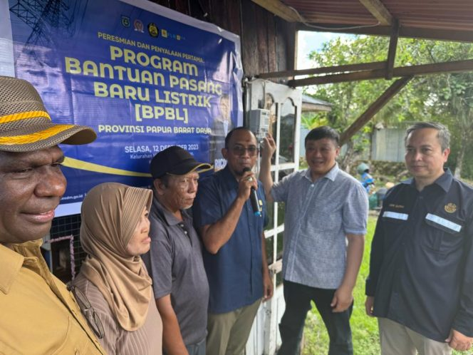 The symbolic ignition of the New Electricity Installation Assistance Program (BPBL) was carried out by a Member of Commission VII of the House of Representatives, Rico Sia, Coordinator of Electric Power Transmission Planning of the Directorate General of Electricity of the Ministry of Energy and Mineral Resources, Muhadi, General Manager of PLN Papua and West Papua Regional Main Unit, Budiono and Expert Staff of the Sorong Regent for Development, Markus Karath in Aimas District, Sorong Regency, Tuesday 12 December 2023.